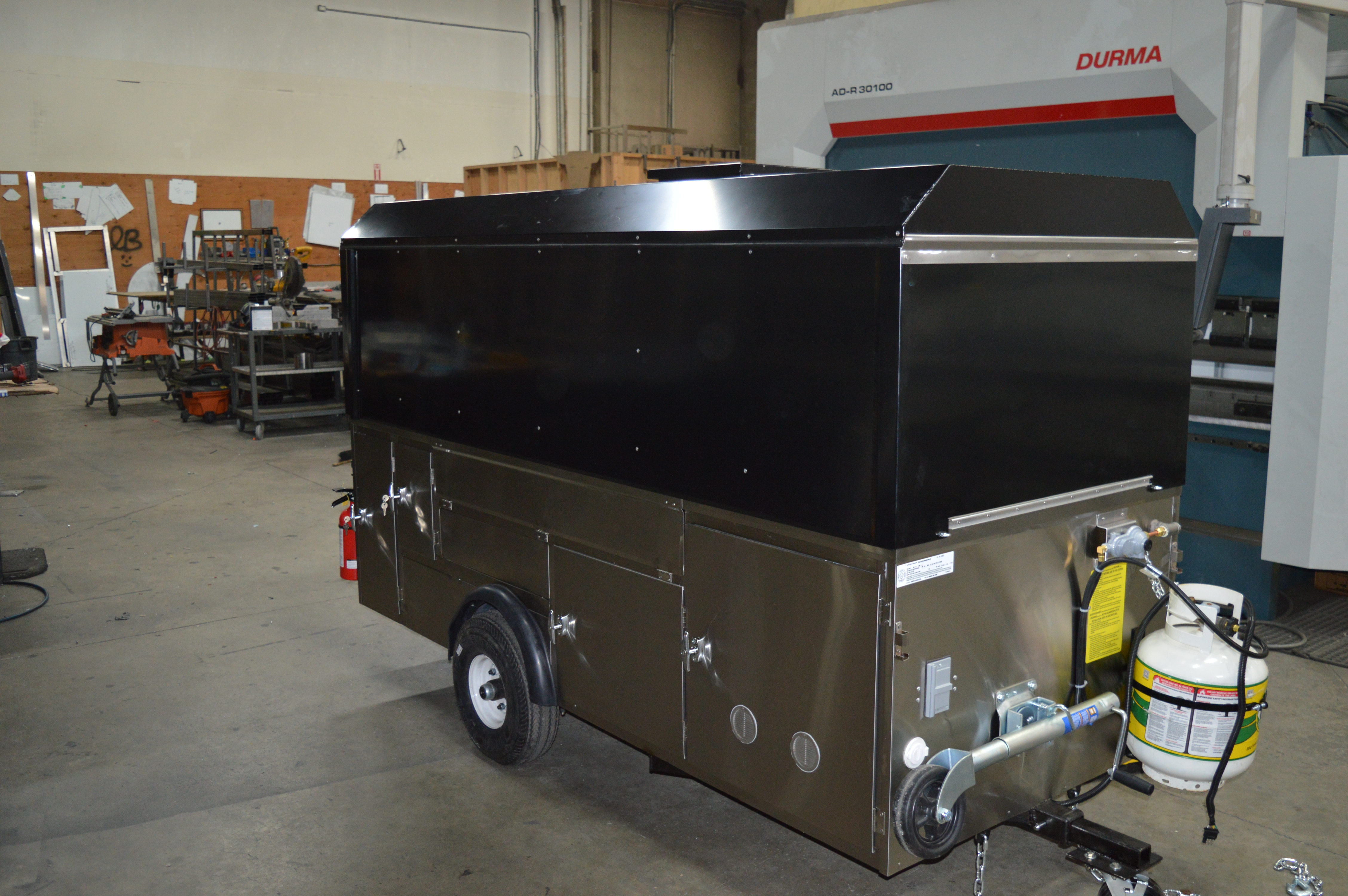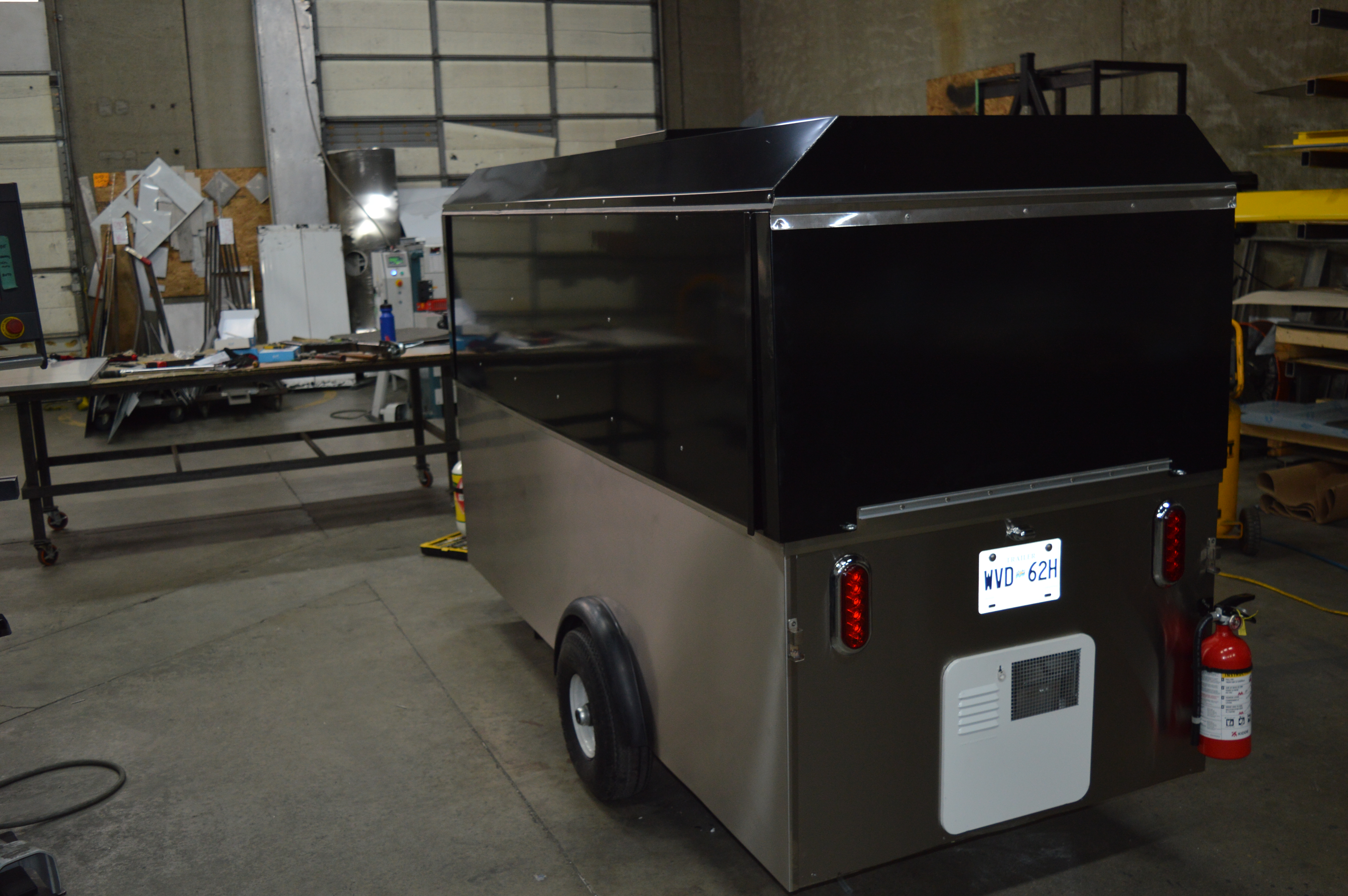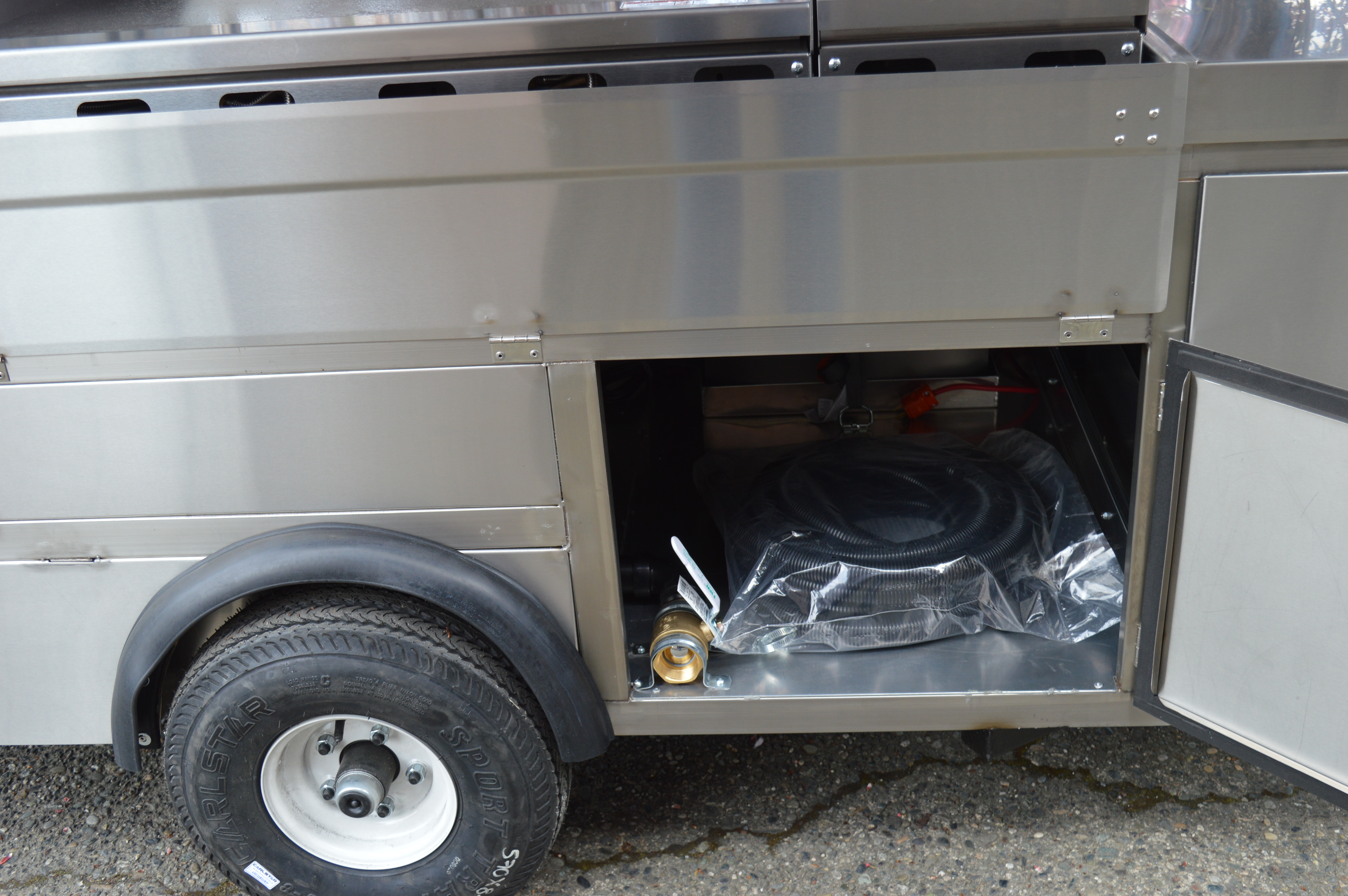 Double ware wash sinks – 10 x 10 x 6’’ deep– Customer to advise if different or cart will ship with double warewash Hand wash sink – 10 x 10 x 6’’ deep Hot and Cold Mixing Faucet 10 Imp Gallon / 45 Litre Fresh Water Tank 15 Imp Gallon / 68 Litre Waste Water Tank – Complete with dump valve and drain hose Shurflo on demand water pump 6 Gallon Suburban Water Heater – Propane Fired All water components are NSF and/or CSA approved